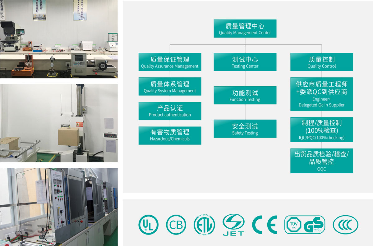 公司视产品质量为企业生命,始终以“质量第一、用户至上”为宗旨,建立完善质量管理体系,不断提高全员质量意识,严格按照国家质量标准组织生产,已经引入了信息化质量管理系统(QMS),从进料检验、首件检验、生产巡检、出货检验、质量分析及改善、品质追溯等均形成实时大数据和信息流。公司已经通过了So9001、1SO14001、BSC等体系认证,公司产品取得了JQA、JET、CC、UL、CB等产品认证。